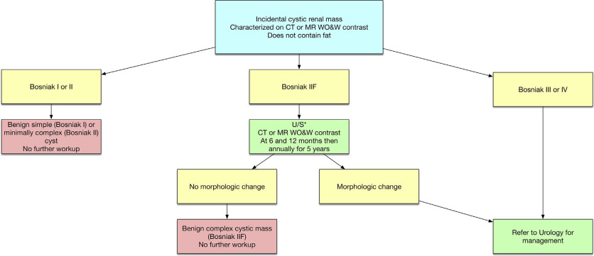 [Flowchart 4] See Table 1 for Bosniak classification system. CT = computed tomography; MR = magnetic resonance; U/S = ultrasound; WO&W = without and with.